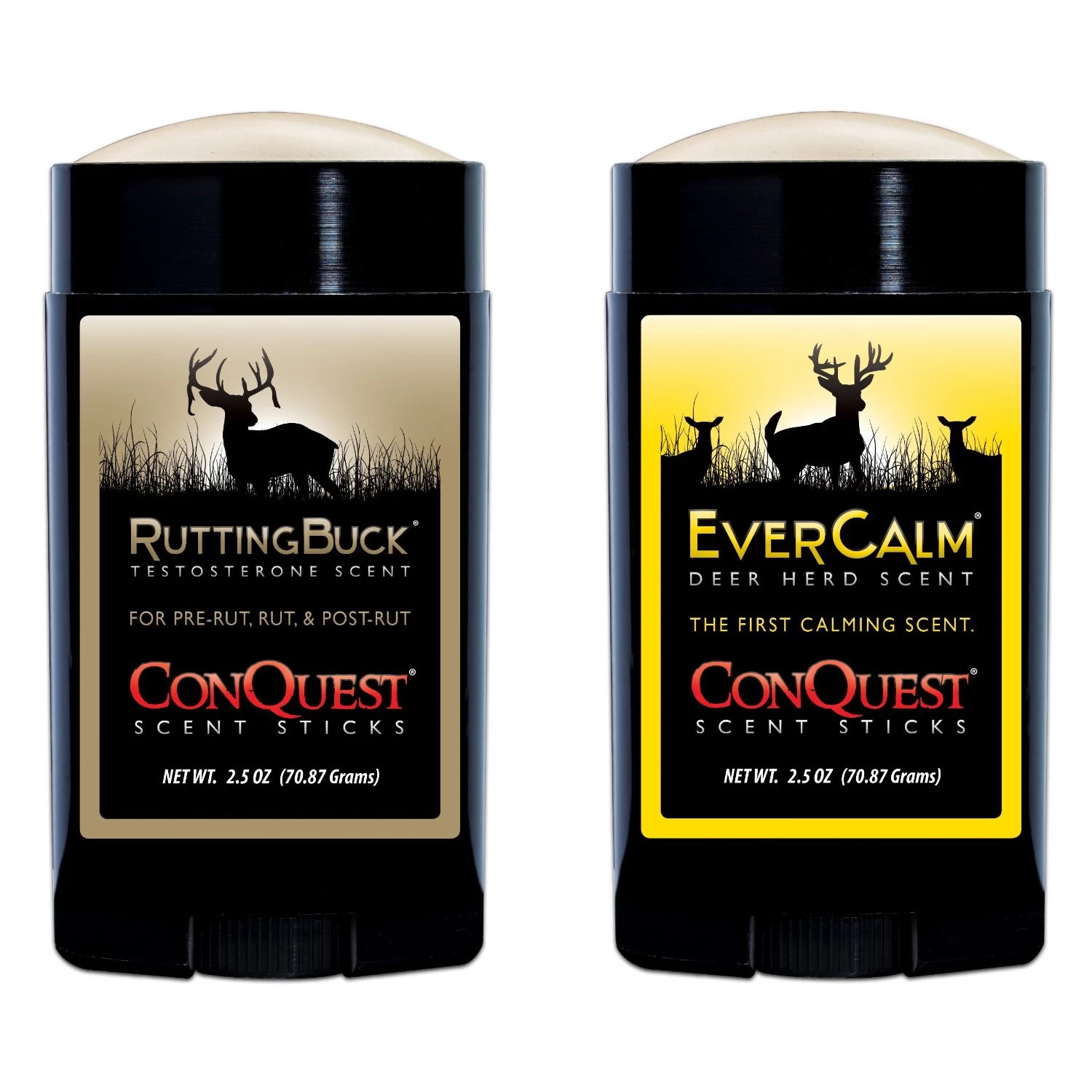RuttingBuck is 100% urine collected from superior breed bucks with high concentrations of testosterone. EverCalm is a collection of scents and smells from actual bedding areas; scents that are so familiar to deer that it puts them at ease!