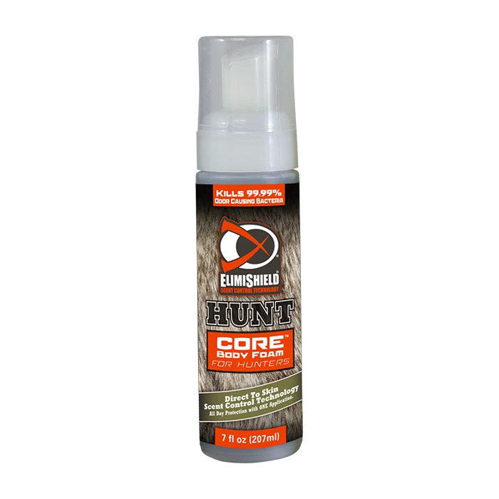 ElimiShield® HUNT Core™ Body Foam kills 99.99% of odor-causing bacteria. Apply directly to skin to kill human odors at the source! Apply a small amount into palms of hands and spread on both hands and all over your body. Paying special attention to odor-causing areas of the body (armpits, feet, hair, etc.), rub into skin until dry.